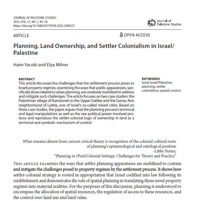 التخطيط، وملكية الأراضي، والاستعمار الاستيطاني في إسرائيل/فلسطين (الإنجليزية فقط)