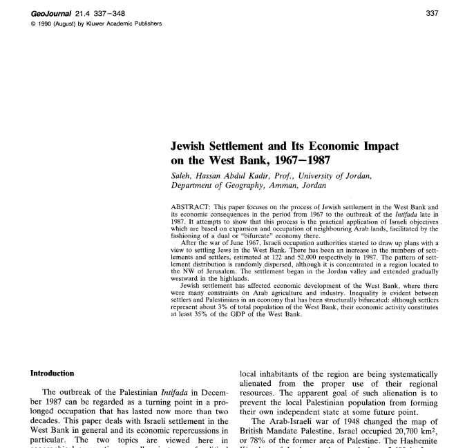 الاستيطان اليهودي وأثره الاقتصادي على الضفة الغربية 1967-1987 (بالإنجليزية فقط)