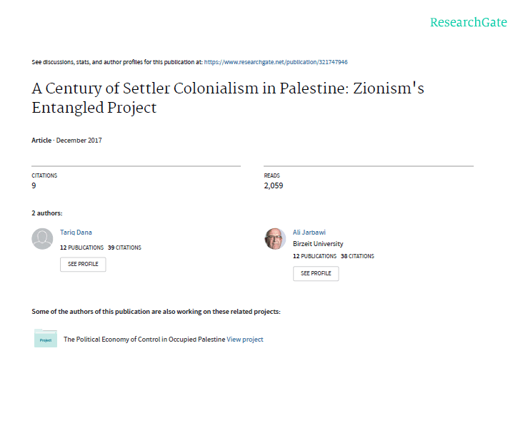 (Journal) A Century of Settler Colonialism in Palestine: Zionism's Entangled Project