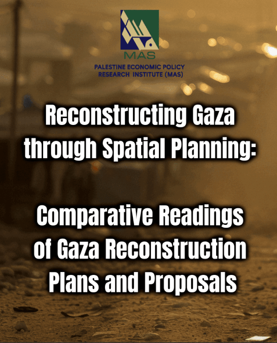 This paper, prepared by the Palestine Economic Policy Research Institute (MAS), serves as a concise analytical reference on the reconstruction plans tabled to date. The paper adopts a comparative critical review of plans and initiatives developed by various entities. These are to be presented and debated within a focused group of specialists and decision-makers, with a central emphasis on spatial and reconstruction dimensions—not as merely technical matters, but as domains intertwined with political, structural, and future-oriented considerations aimed at directing the shape of life and governance in Gaza over the coming years.