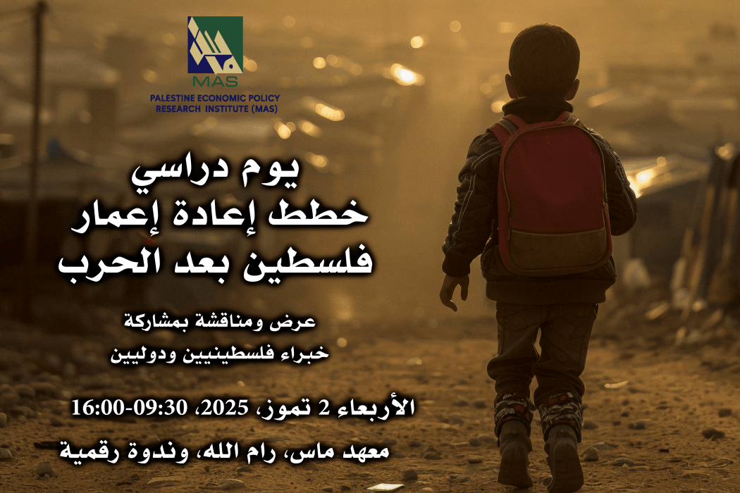 في إطار متابعة معهد أبحاث السياسات الاقتصادية الفلسطيني (ماس) للتداعیات الاجتماعیة والاقتصادیة للحرب منذ أكتوبر 2023 وحوارات سابقة حول الإغاثة والتعافي وإعادة الإعمار، عمل المعهد على حصر الأدلة المعرفية قبیل الشروع في أبحاث سیاساتیة أكثر منھجیة حول الخطط المطروحة لإعادة الاعمار، ولاحقاً للمشاورات المذكورة حول الإغاثة والتعافي، بات من المفید أيضا التعرف بشكل مفصل على مختلف مخططات إعادة الإعمار المطروحة حالیاً لقطاع غزة، ومن ھنا هذه المبادرة لتنظیم "الیوم الدراسي حول إعادة الإعمار بعد الحرب"، والذي سيتعمق في عدد من المقاربات المقترحة حالياً لإعادة الإعمار ويضعها في سياق ما قد ينتظرنا.