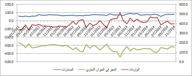 في المقابل شهد شهر تشرين ثاني تراجعا في هذه المتغيرات، حيث تراجعت الصادرات (76.0 مليون دولار) بنسبة 0.7% بالمقارنة مع تشرين أول وبنسبة 10.6% بالمقارنة مع تشرين ثاني 2013. وقد شكلت الصادرات الى إسرائيل 81.3% من إجمالي قيمة الصادرات وبهذا تكون انخفضت بنسبة 4.5% عن الشهر السابق وارتفعت بمقدار 20.4% بالمقارنة مع الشهر المماثل من عام 2013. أما بالنسبة للواردات (396.0 مليون دولار) فارتفعت بنسبة 0.4% خلال تشرين ثاني وبنسبة 2.0% بالمقارنة مع تشرين ثاني 2013. انخفضت الواردات الى إسرائيل بنسبة 6.4% بالمقارنة مع الشهر الماضي لتصل الى 60.6% من إجمالي الواردات خلال تشرين ثاني 2014 ولكنها ارتفعت بنسبة 13.0% بالمقارنة مع الشهر المماثل من العام 2013. العجز في الموازنة بلغ 320.0 مليون دولار وهو تقريبا ما كان عليه في تشرين أول 2014.
