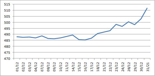 ارتفع مؤشر القدس بنسبة 6.1% في الشهر الأخير من العام المنصرم، وأغلق المؤشر على 511.77 نقطة في آخر يوم تداول - 31 كانون أول وكان هذا أعلى مستوى للمؤشر خلال الفترة من 15 تشرين أول وحتى نهاية العام. وأقل قيمة للمؤشر في شهر كانون اول كانت يوم الثلاثاء من الأسبوع الثالث، حيث انخفض المؤشر الى 485.39 نقطة. ويبين الشكل 1 أدناه حركة مؤشر القدس خلال كانون أول 2014.