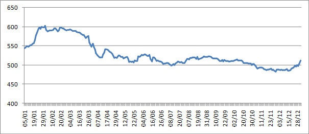 وعلى عكس شهر كانون أول، شهد مؤشر القدس انخفاضا بنسبة 5.8% خلال العام 2014. أعلى قيمة للمؤشر (603.03 نقطة) كانت في الثاني من شهر شباط 2014، وفي المقابل كانت أدنى قيمة للمؤشر (482.45 نقطة) في 30 تشرين ثاني 2014. يوضح الشكل 2 القيم اليومية لمؤشر القدس خلال العام 2014.