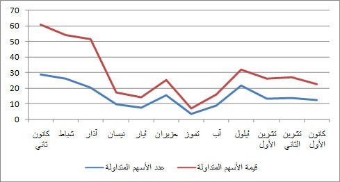 الشكل 3: حجم وقيمة الأسهم المتداولة، 2014