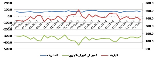 الشكل 1: الصادرات والواردات، والعجز في الميزان التجاري، فلسطين، 01/2012 - 01/2015 (مليون دولار)