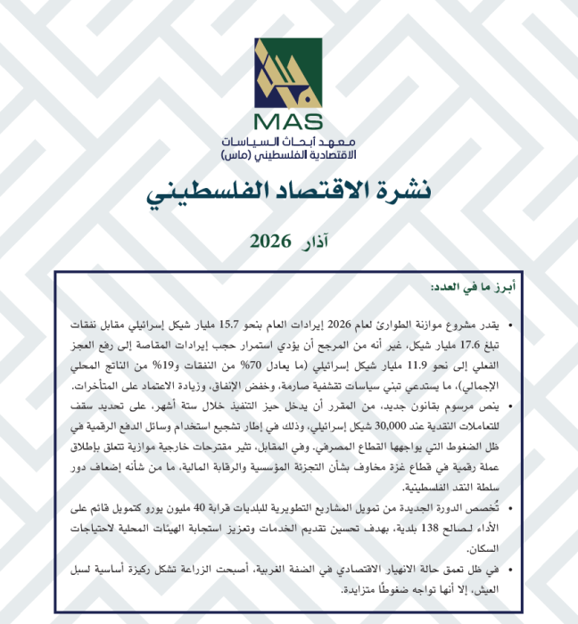 نشرة الاقتصاد الفلسطيني - آذار 2026